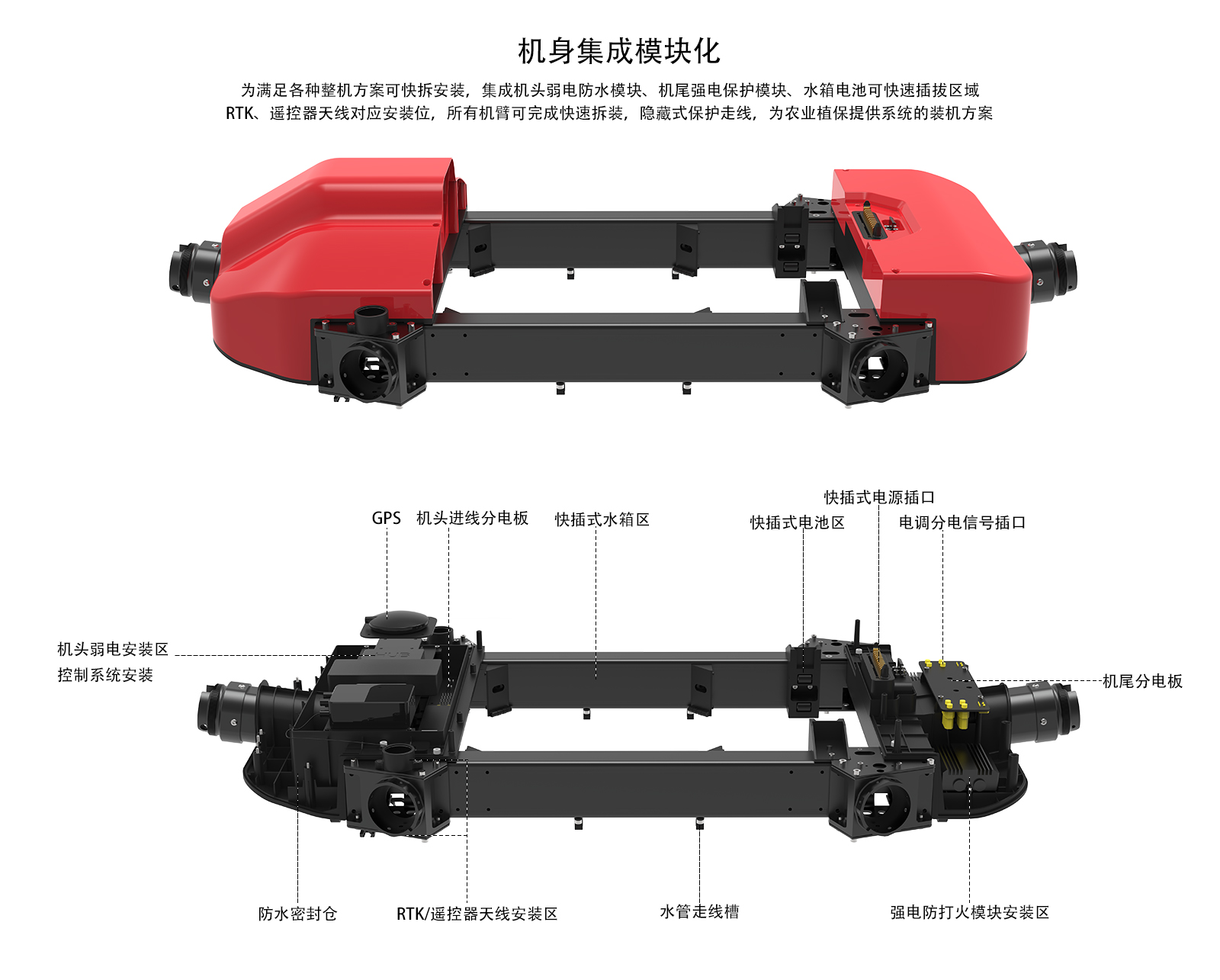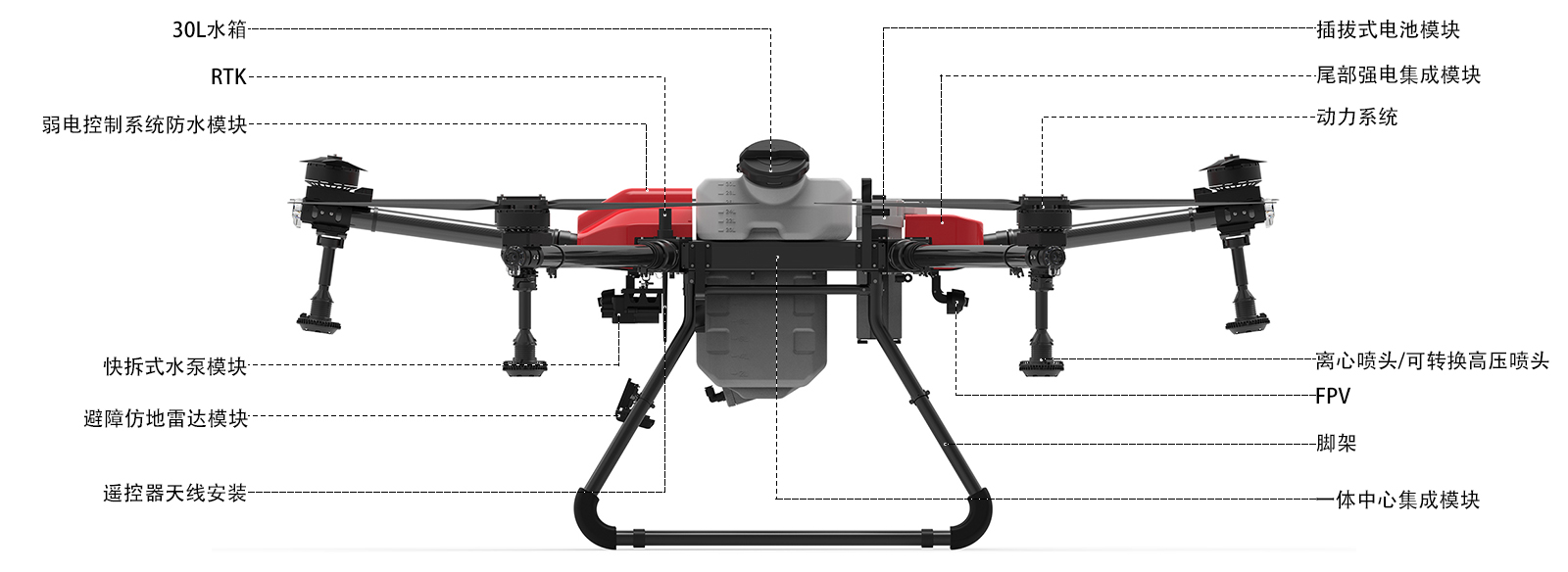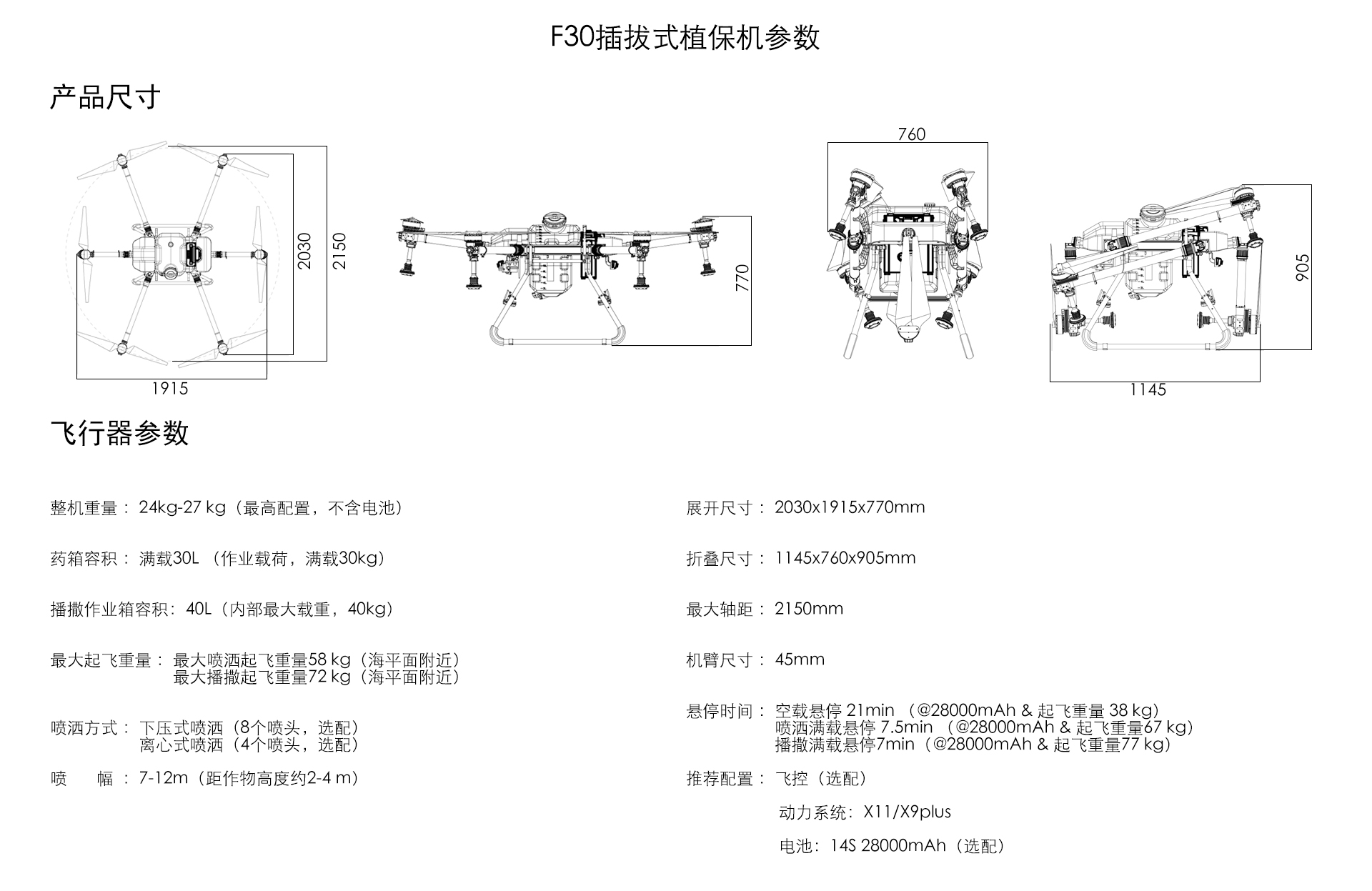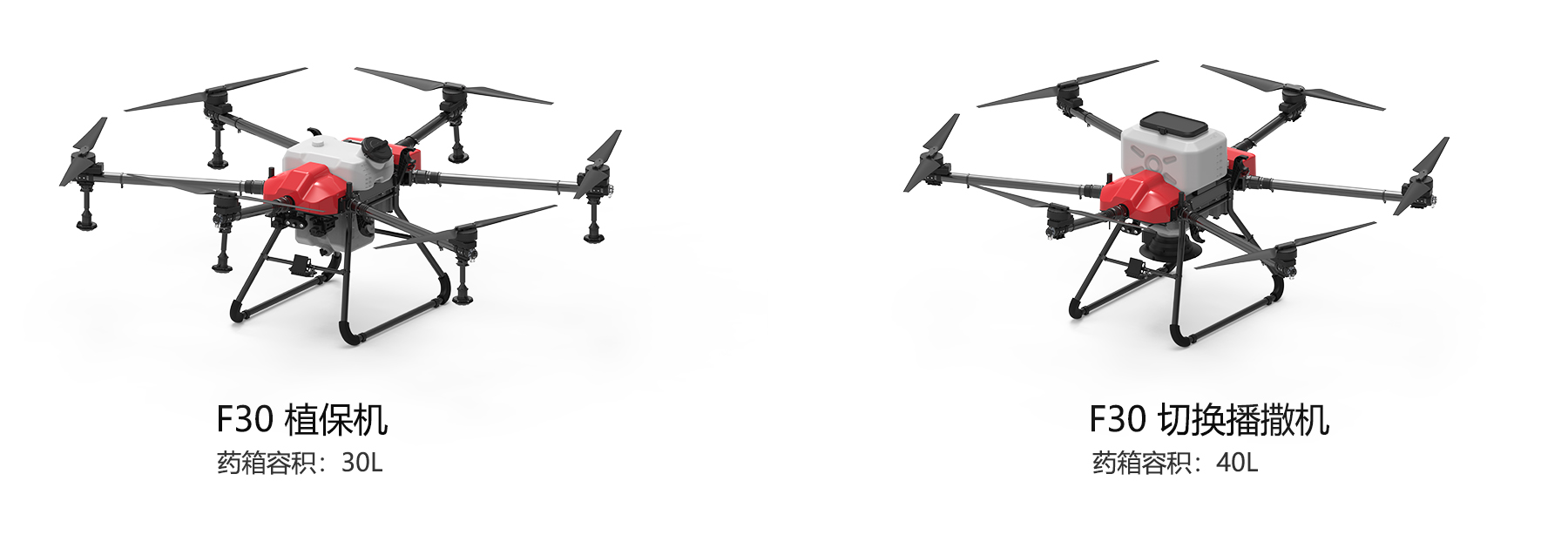 F30 将植保无人飞机结构的最大载重提升至 40 公斤,提供更高的装机平台;快速折叠的“变形”机身,精简的模块化设计装机省时省力;搭配相关控制系统优化农业解决方案,用机成本更低 一体模块化,可搭载30L药箱喷洒,40L颗粒播撒系统,一机多用快速转换