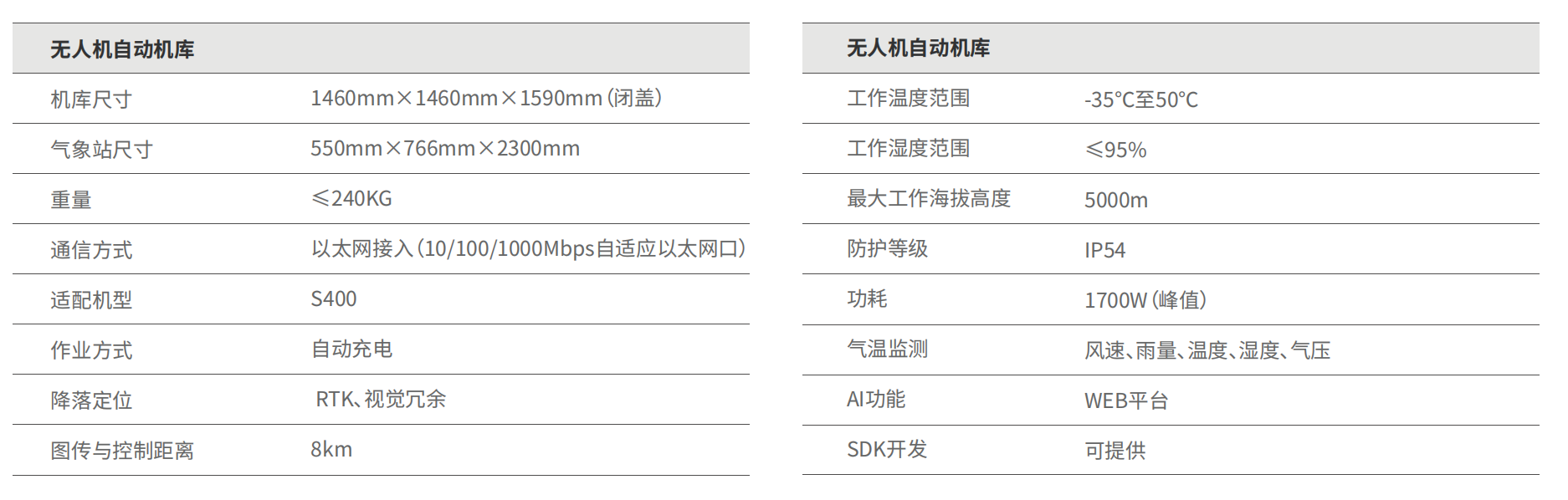 6级抗风,安全起落:飞机起飞和降落阶段可承受的最大风为15m/s;机库整机IP54标准,从容应对恶劣天气和复杂应用场景;