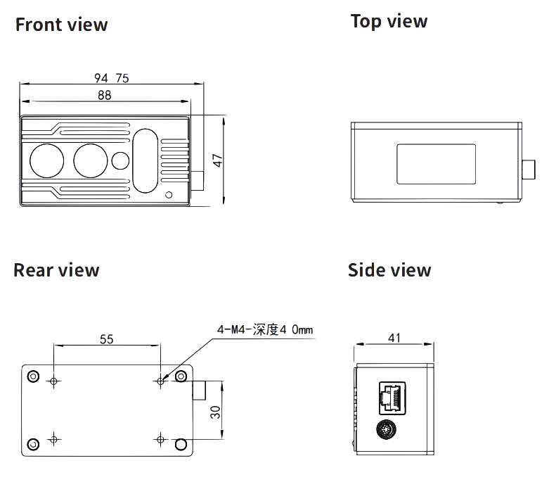 | 工作距离 | 0.2m-5m (90% 反射率); 0.2-2.5m (10% 反射率) |