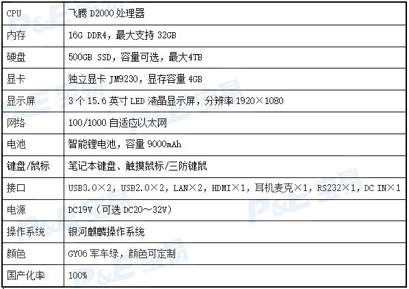 宝易三屏加固便携式计算机PER-J15A1701-QT-F,为特殊行业设计,满足野外恶劣环境下移动工作的使用要求;国产飞腾D2000处理器,搭配4G独立显卡,支持三屏显示,大容量电池,可定制扩展舱,满足各种计算运算需求;可通过自定义摇杆和自定义按键实现,整机采用铝合金一体成型外壳,宽温、抗振动、抗冲击、防尘防水、抗电子干扰设计,高可靠与高性能的完美结合,在极端恶劣环境中也能毫无障碍的流畅工作运行;产品能够满足GJB367A-2001,GJB151B-2013关于振动、冲击、电磁兼容、三防、盐雾、霉菌等相关要求,具有高可靠性和稳定性,是军事应用上的理想之选。