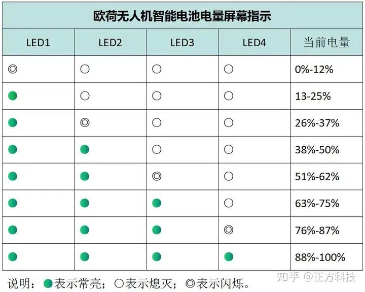 欧荷智能无人机电池设计四个高亮LED指示灯,进行放电或充电时,能够自动识别状态进行电量指示;电池处于关机状态时,短按按键,LED指示电量约2S后熄灭。