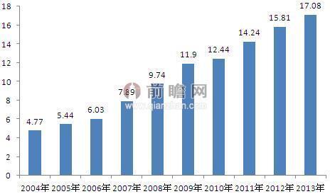 2004-2013年全球无人机生产商数量走势图(单位:个)