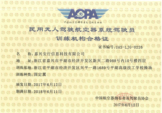 中国航空器拥有者及驾驶员协会(AOPA-China)是国际航空器拥有者及驾驶员协会(IAOPA)的中国分支机构,是IAOPA在中国(包括台湾、香港、澳门)的唯一合法代表,由中国民用航空局业务指导,代表中国私用航空器拥有者及驾驶员利益,接受国际航空器拥有者及驾驶员协会监督、指导及相关规章约束的全国性社团组织。AOPA机长证是专业无人机飞手的证明,是广大无人机飞手就业、创业的重要证件。 安行公司于2017年取得了AOPA培训及考核资质,公司在平湖有合法的室外飞行实训场地,教员全部是拥有多年飞行经验的资深飞手,同时公司与平湖高级技工学校合作创办了无人机专业,有着强大的师资力量,为学员在考取AOPA证书的过程中提供优质的教学服务和愉悦的学习体验。