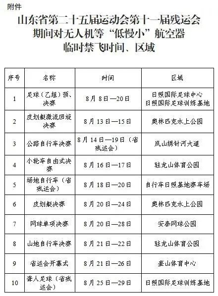 山东省第二十五届运动会、第十一届残运会正在我市举办。整个赛程从5月28日开始,至9月20日结束。8月25日,将在奎山体育中心举行省运会开幕式。9月5日、9月16日,将在香河体育公园分别举行省运会闭幕式、省残运会开幕式。本届省运会共有58个项次、省残运会共有17个项次的比赛,将有部分项目在室外和半封闭式场馆举行。为确保开闭幕式及赛事期间周边区域空中安全,杜绝各类“低慢小”航空器违法违规飞行活动发生,根据《中华人民共和国刑法》《中华人民共和国治安管理处罚法》《中华人民共和国飞行基本规则》等法律法规规定,现就有关事项通告如下:一、本通告所称的“低慢小”航空器是指具有“超低空飞行、速度慢、不易被雷达发现”等全部或部分特征的小型航空器和空飘物,主要有轻型和超轻型飞机、轻型直升机、滑翔机、三角翼、动力三角翼、滑翔伞、动力伞、热气球、飞艇、无人机、航空模型、航天模型、空飘气球、系留气球等。二、2022年8月11日0时至9月21日0时开幕式及赛事期间(时间、区域见附表),场馆(地)及周围半径2公里的区域划定为临时空中管制区。在临时空中管制区域,禁止升降无人机等“低慢小”航空器和放风筝、气球等影响赛事活动安全的行为。确有飞行需要的,除依法报请有关部门审批外,还需经省运会日照市筹备工作委员会书面批准。三、临时管控期间,公安机关将会同无线电管理等部门开展联合巡查、管控。请广大市民、企事业单位及飞行爱好者主动配合,自觉遵守本通告规定,杜绝违法违规飞行。四、凡违法违规飞行无人机等“低慢小”航空器的,公安机关将会同有关部门依法查处,对违反治安管理的,依法予以治安处罚;构成犯罪的,依法追究刑事责任。