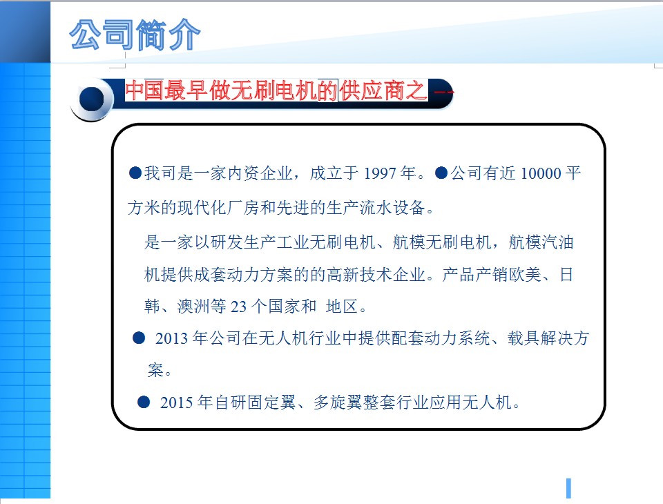 •我司是中国最早做无刷电机的供应商之一。以下是图文简介 :