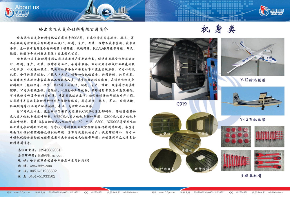 哈尔滨飞天复合材料有限公司成立于2008年,主要经营范围为航空、航天、军工等领域高性能复合材料制品的设计、研制、生产、改装、维修及技术咨询、技术服务等,是一家中高端复合材料制品(碳纤维、玻璃纤维、KEVLAR纤维等增强、环氧、聚酯、酚醛等合成树脂为基体)的高技术公司。