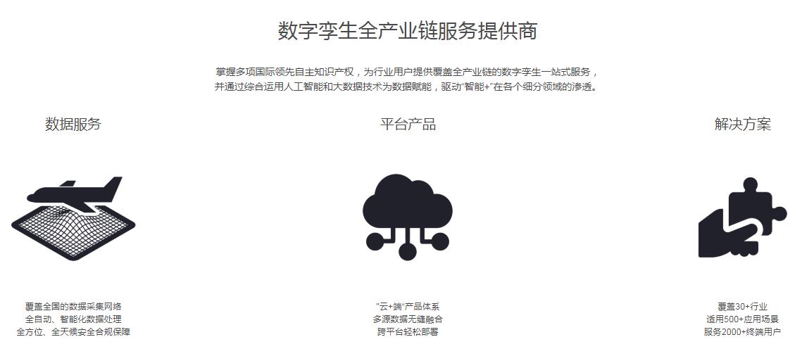 面向智慧城市行业提供公共安全大脑、城市应急大脑和神经元社区大脑等服务;面向工业企业提供能源、通讯、化工、先进制造等智慧工厂解决方案;面向智能驾驶行业提供自动驾驶模拟仿真和场景库服务和智能车辆网联解决方案等。客户覆盖30+行业、产品适用500+应用场景、服务2000+终端用户。