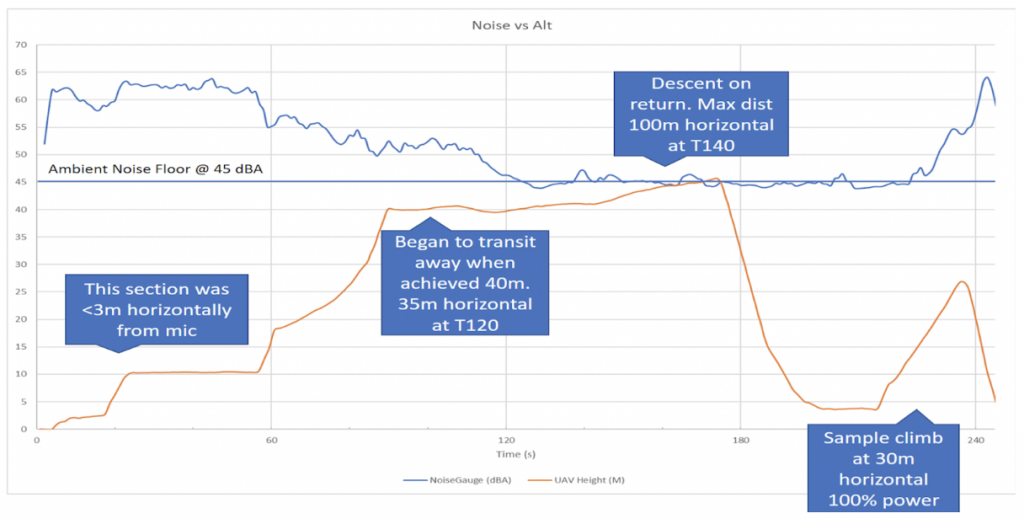Manna无人机设计为在巡航高度甚至在我们较低的15米交付高度时完全听不到,这不比正常谈话响亮。看看下面的图表,该图表显示了我们的海拔高度与我们产生的噪声水平之间的关系。