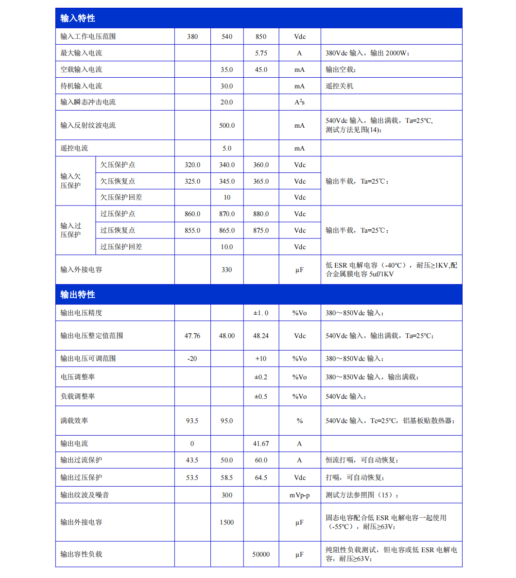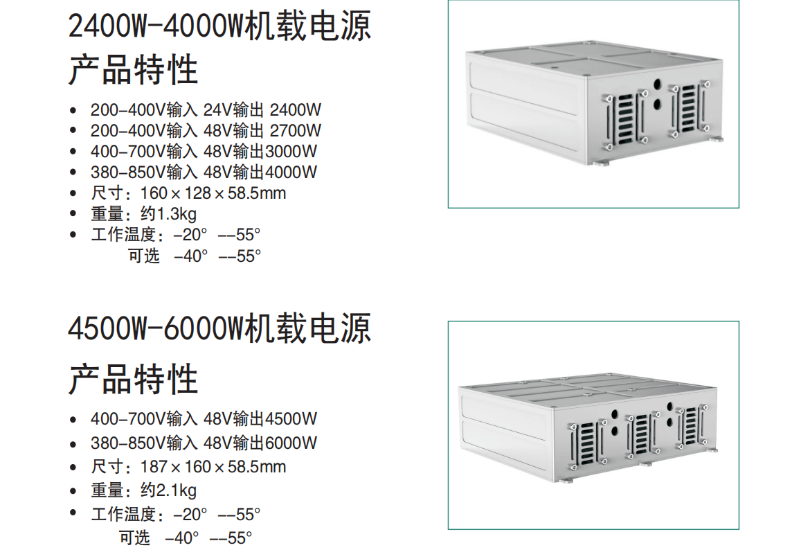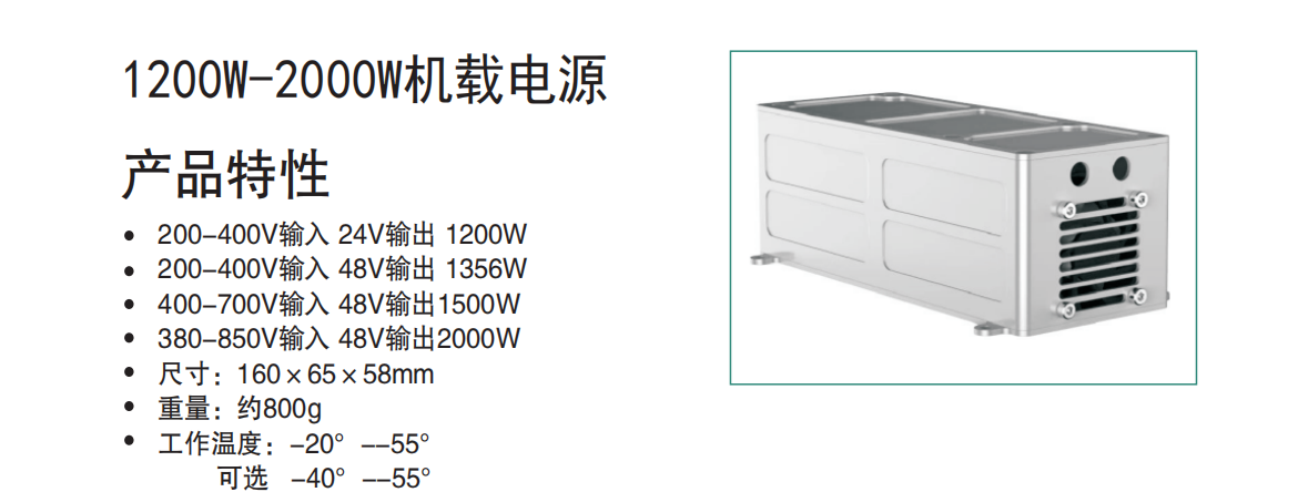 适用于系留无人机、水下机器人、军工的高压直流电源转换低压直流的电源模块,输入380-850Vdc(欠压360V,过压870V),输出24、28、36、48Vdc 额定功率2000W,峰值功率2200W。可10个模块并联至20KW。可以选择AC220V或者380V的发电机给系留箱供电,系留箱里的地面电源将AC220或380V转换成DC850V,通过系留线缆传输至该电源模块转换成适合6S或者12S无人机的电压,为无人机提供长时间续航供电。该机载电源模块可支持7*24小时不间断工作,为国防军工、消防救援提供稳定高可靠的供电方案。