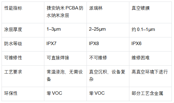 与真空镀膜、派瑞林等传统工艺相比,捷安纳米PCBA防水纳米涂层在扫地机器人PCBA板防护领域优势显著: