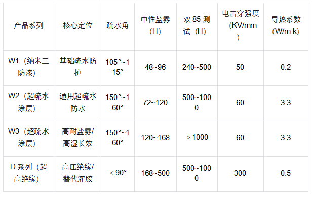 捷安纳米防水涂层按应用场景分为四大系列,各项关键性能指标清晰差异化,满足从常规防护到高压、高盐雾、高温高湿的全场景需求。