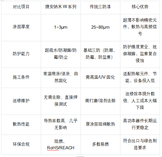 传统丙烯酸、聚氨酯、有机硅三防漆存在厚度大、散热差、返修难等痛点,捷安纳米涂层从性能、工艺、成本实现全面超越。