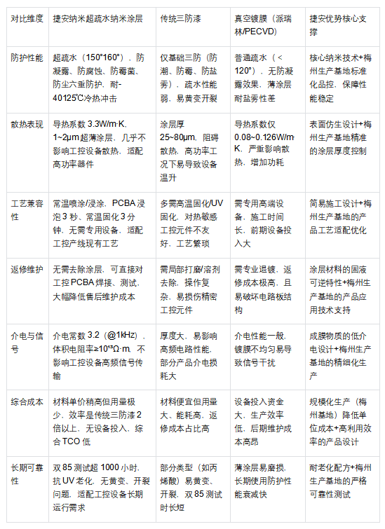 捷安纳米超疏水纳米涂层相较于传统三防漆、真空镀膜等工控行业常用防护方案,在防护性能、工艺适配、综合成本等方面形成全方位碾压,梅州生产基地的规模化生产更让这些优势落地为可量产、可普及的行业解决方案,具体优势如下表所示: