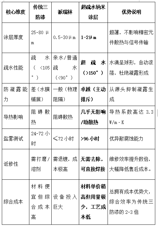防凝露,早已不是简单的“防水”问题,而是关乎热管理、材料科学、工艺效率的综合系统工程。传统的厚膜防护与复杂的真空镀膜,在“超薄、超疏水、易返修”的新一代纳米涂层面前,已显露明显技术代差。