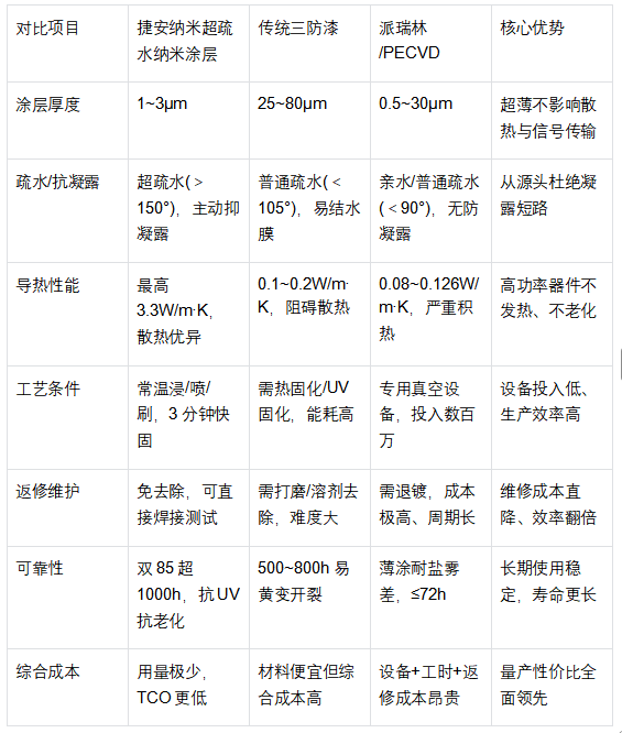 传统方案看似能防护,实则留下更大隐患:传统三防漆膜厚导热差、灌封胶不可返修、派瑞林设备投入大且不疏水。