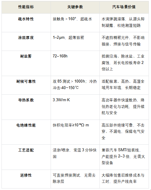 在博世等头部车企电控项目中,超疏水涂层有效抑制凝露、通过1000小时带电双85测试,客诉率大幅下降,寿命与可靠性显著提升,为大规模上车奠定坚实基础。