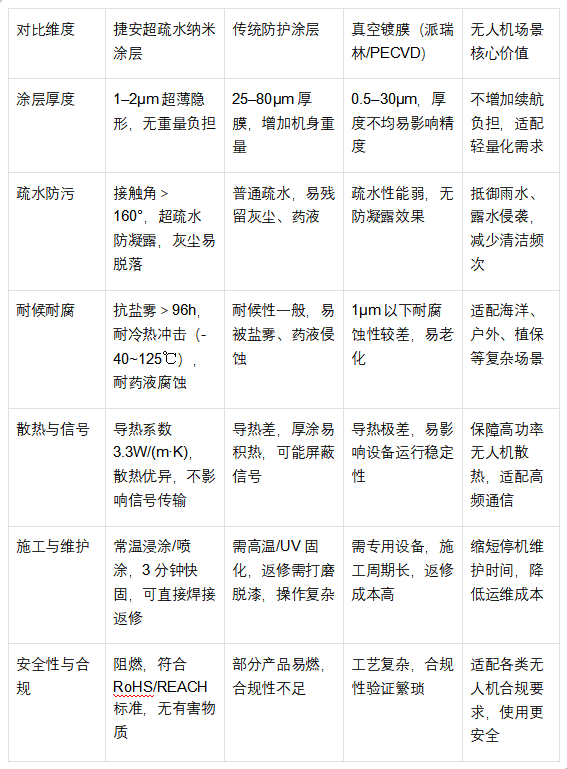 捷安纳米超疏水纳米涂层,摒弃系列区分,以统一的高性能适配无人机全品类、全场景防护需求,相较于传统防护方案及真空镀膜技术,优势凸显,具体对比如下: