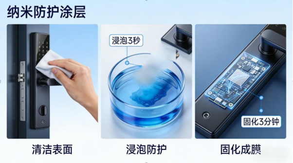 针对冷凝水的形成机制与危害,纳米防护涂层通过材料特性与工艺优化,实现 “防、疏、隔” 三重防护,成为智能门锁防凝露的理想方案: