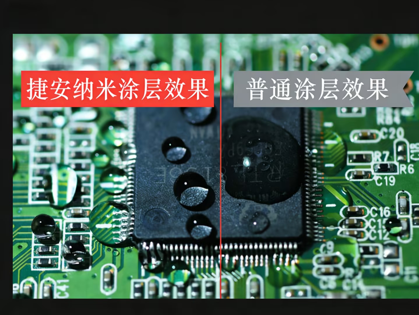 2. 性能保障:贵价涂层如捷安纳米涂层在挥发稳定性、透明度、疏水性、耐腐蚀性等核心指标上均经过严格测试,可实现360度全方位防水、防潮、防腐蚀,适配高密度、高复杂度的PCBA板,有效提升电子设备运行稳定性、降低售后故障;低价涂层仅能满足基础表面覆盖需求,防护性能差、使用寿命短,易导致设备故障,反而增加后续维护成本;