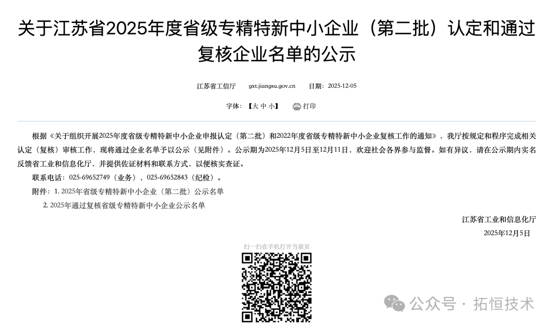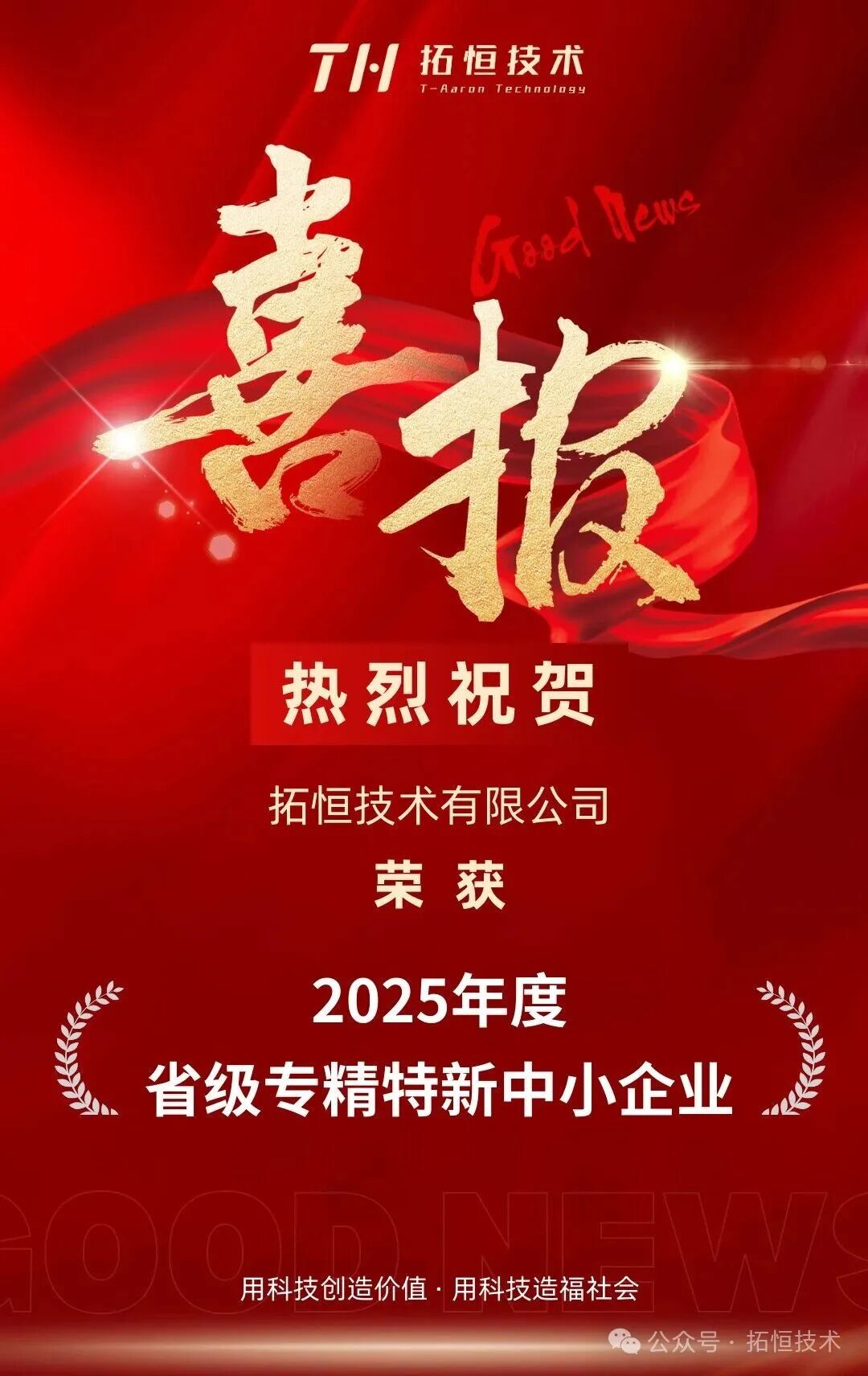 喜报丨热烈祝贺拓恒技术荣获江苏省“2025年度省级专精特新中小企业”