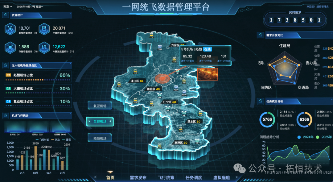从指挥中心智慧大屏,到电脑端与移动终端,拓恒技术“空地一体安保巡警建设方案”构建了全覆盖、全协同的指挥应用生态。我们以科技之力,紧密联结空中感知、数据智能与警务实战,推动城市安防从被动应对走向主动预警,从人力密集走向智慧高效。我们坚信,用科技创造价值,用科技造福社会,共同构建一个更安全、更智慧的城市未来。