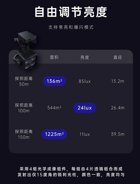 科比特独火星L60 云台灯,采用4组光学成像组件,每组由4片透镜组合而成,发射出仅15度角的锐利光柱,颜色一致,亮度均匀, 在120w 时,100m的光斑中心照度值高达24lux;在150m的照射高度下,有效照射面积高达1225平方米,将无人机夜间作业的空中 照射效果,提升至全新高度。整体采用超轻量设计,仅重克,额定功率高达120W,可满足夜晚巡查、警告驱离、方位指示、电力巡线、搜索救援等夜间作业需求。