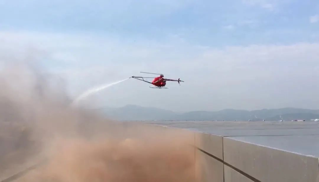 saga在高空中传回灾情画面,商场顶部有大量浓烟冒出,火势还在蔓延。消防重型无人直升机宙-300携带150公斤高效泡沫和灭火弹受命起飞,对楼顶火灾迅速进行扑救,完成初期控火工作。