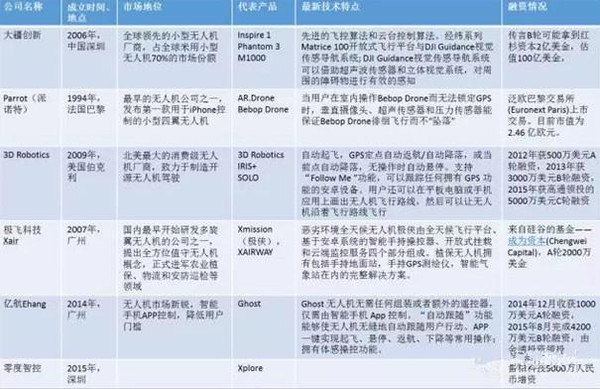 下表是对市场上几家着名的无人机厂商的融资情况和技术特点做一个简单的总结。