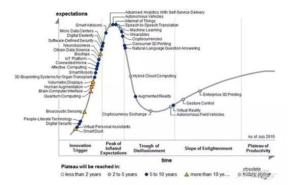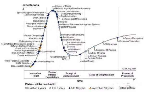 看到上面的融资及产品发布现状,结合下面2014到2015的Gartner技术成熟度曲线,基本可以认为,无人机技术已经度过了“创新萌芽 Innovation Trigger”期和“期望最顶点Peak of Inflated Expectation”的早期,进入稳步发展时期,甚至可以预见,在未来的5到10年里,恐怕将有一批创业企业无以为继,市场开始洗牌重组,而后进入稳 步增长期。