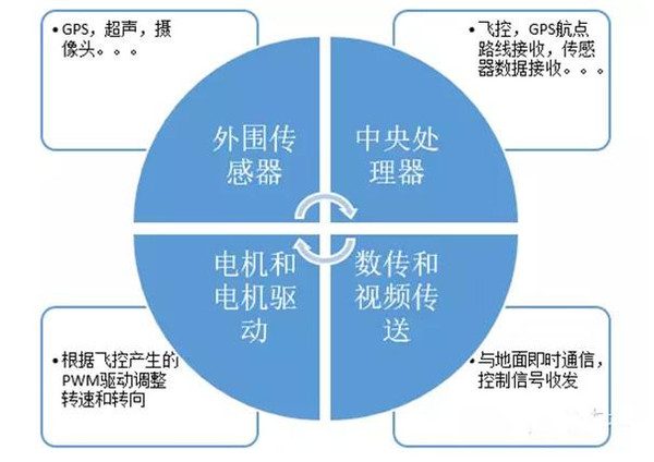 目 前看来,市场上较为流行的消费级多旋翼无人机中,无论是在飞控算法和云台控制上有绝对优势的大疆,还是在自动控制和传感器应用上具有技术领先优势的3D Robotics和Parrot,其基本的操作系统架构基本由中央处理器(MCU、ARM早期型号、ARM Cortex系列)、外围传感器(GPS,超声,摄像头等)、电机和电机驱动芯片、数传模块和图像传输模块组成,总结如下: