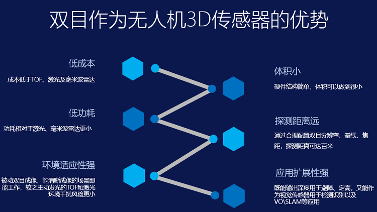 但常见的红外和超声波目前都是单点测距,只能获得特定方向上的距离数据,而双目视觉可以在小体积、低功耗的前提下,获得眼前场景的比较高分辨率的深度图,这就让避障功能有了更多的发展空间,比如避障之后的智能飞行、路径规划、对农作物的生长情况,病虫害等情况进行视觉提取与分析。