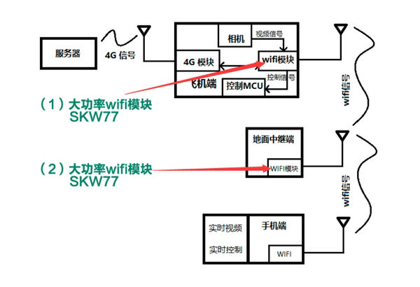 飞机端WIFI模块主要功能有与地面中继端建立WIFI连接;将相机视频传给地面中继端;将地面中继端传过来的控制信号传给控制MCU;将飞机状态信息及视频通过4G模块传给远程服务器。