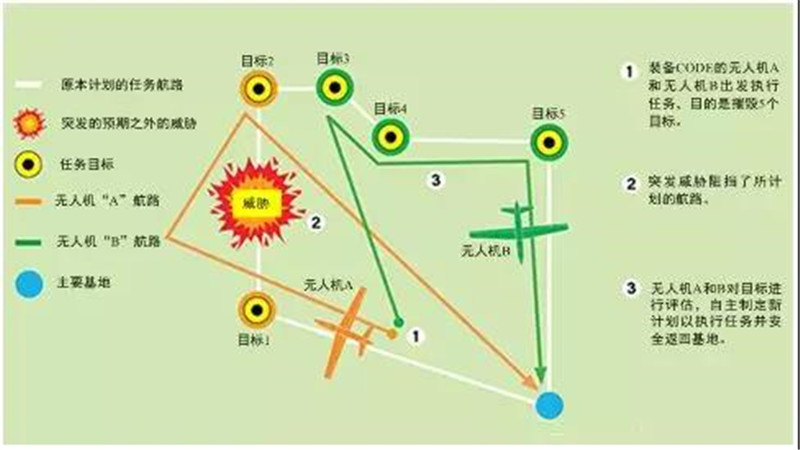 CODE项目将支持多架装备CODE的无人机协同感知、适应并响应预期之外的威胁和新目标。该项目系统可支持共享信息、规划并分配任务目标、协调战术决策并在高威胁环境中作出响应。